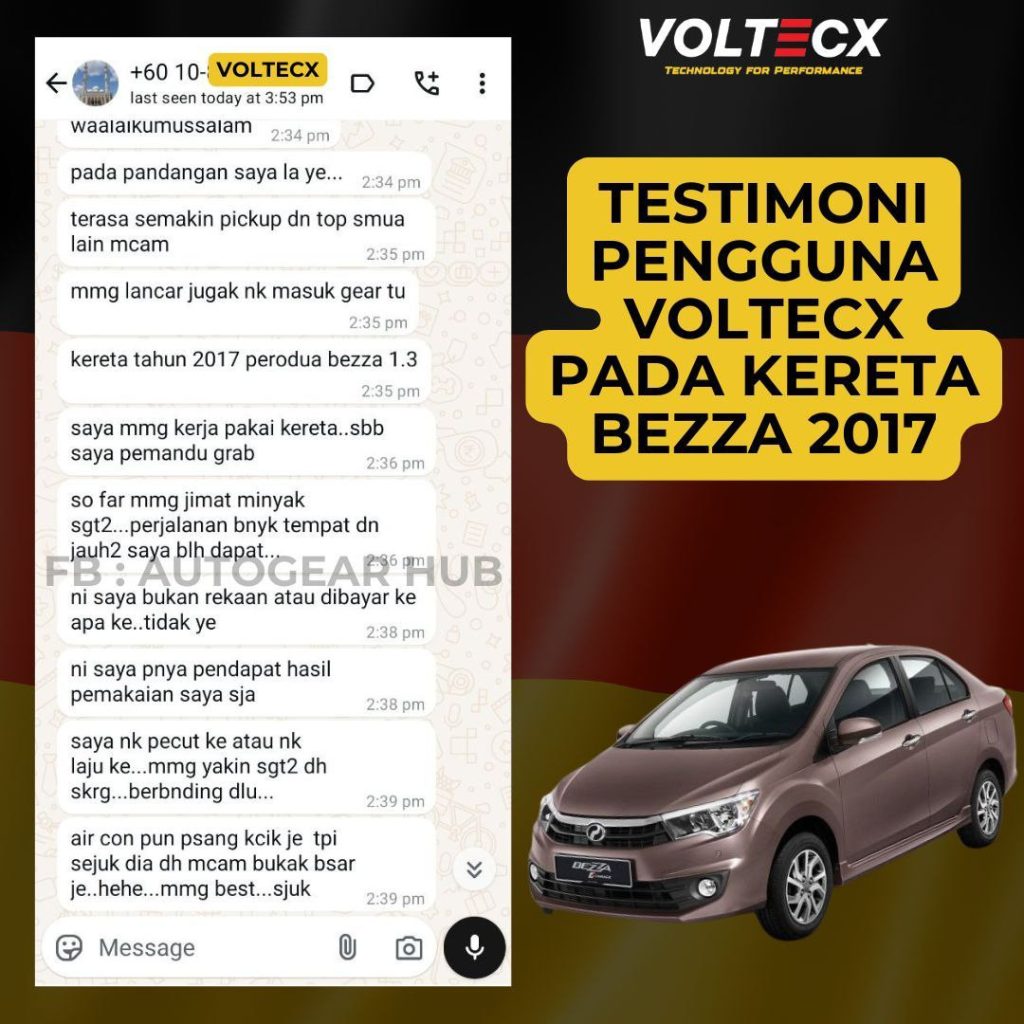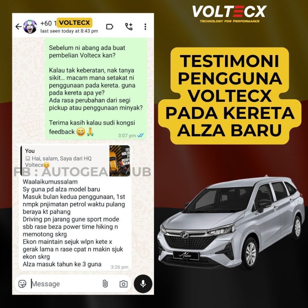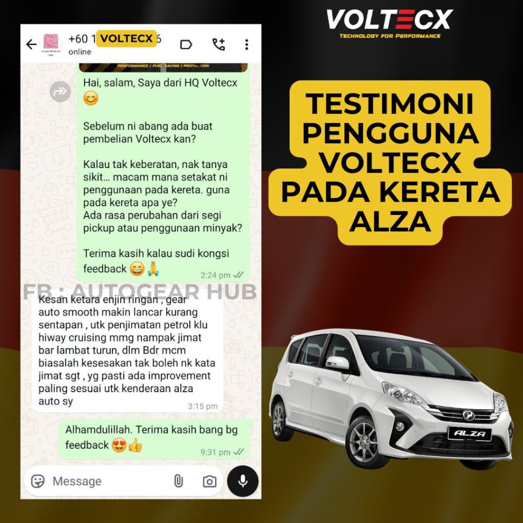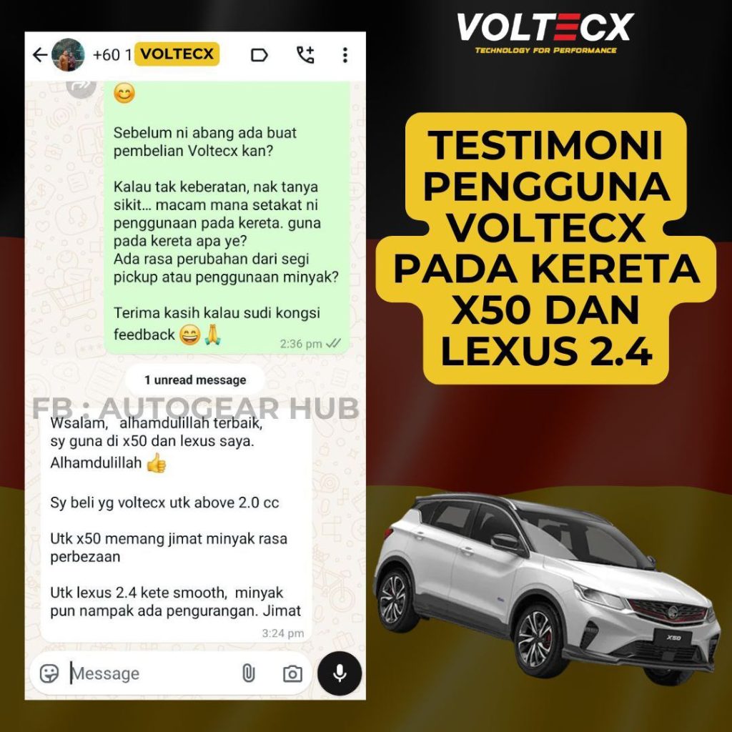 Pada masa yang sama, Voltecx mengurangkan beban pada alternator dan sistem pengecasan, menjadikan putaran enjin lebih ringan dan lancar. Kenderaan akan menunjukkan peningkatan dari segi respon throttle (pickup), kestabilan RPM, penukaran gear yang lebih halus (terutama kereta auto), serta prestasi penghawa dingin yang lebih sejuk kerana komponen elektrik berjalan pada voltan ideal.