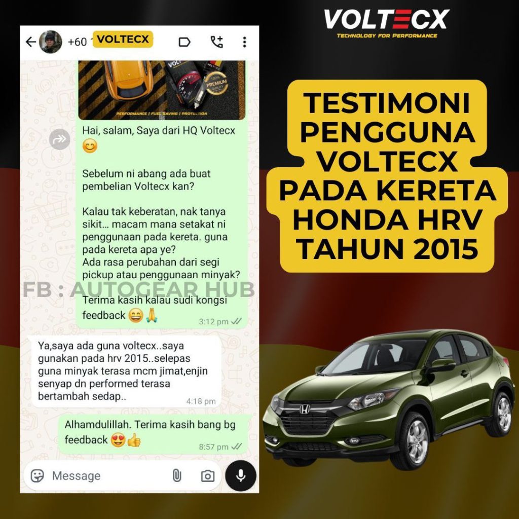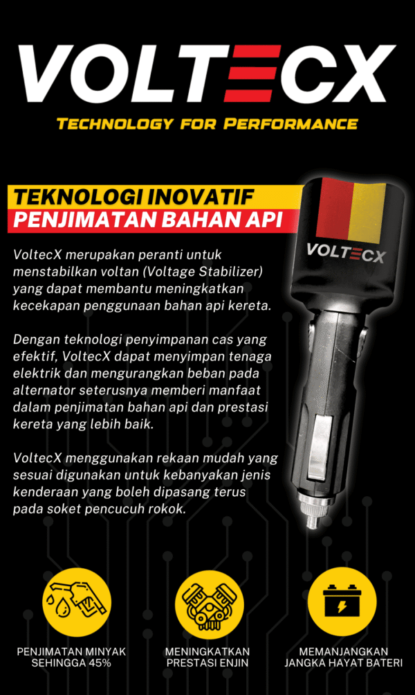 Voltecx berfungsi sebagai penstabil arus elektrik (electrical voltage stabilizer) yang membantu sistem elektronik dan enjin kenderaan beroperasi dengan lebih cekap. Apabila Voltecx dicucuk ke soket pencucuh rokok (12V port), ia mula menstabilkan voltan DC dalam kenderaan, lalu mengurangkan “voltage ripple” atau turun-naik arus yang sering berlaku semasa engine running.