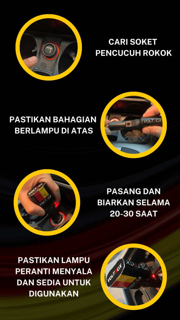 Hidupkan enjin kereta dan cucuk Voltecx pada soket pencucuh rokok dan tunggu 15-20 saat. Pastikan LED Voltecx menyala menandakan Voltecx telah berfungsi.