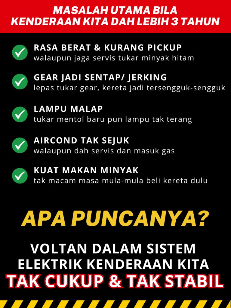 Keseluruhan sistem elektrik jadi lebih stabil dan cekap tanpa sebarang pengubahsuaian pada enjin atau litar kereta.